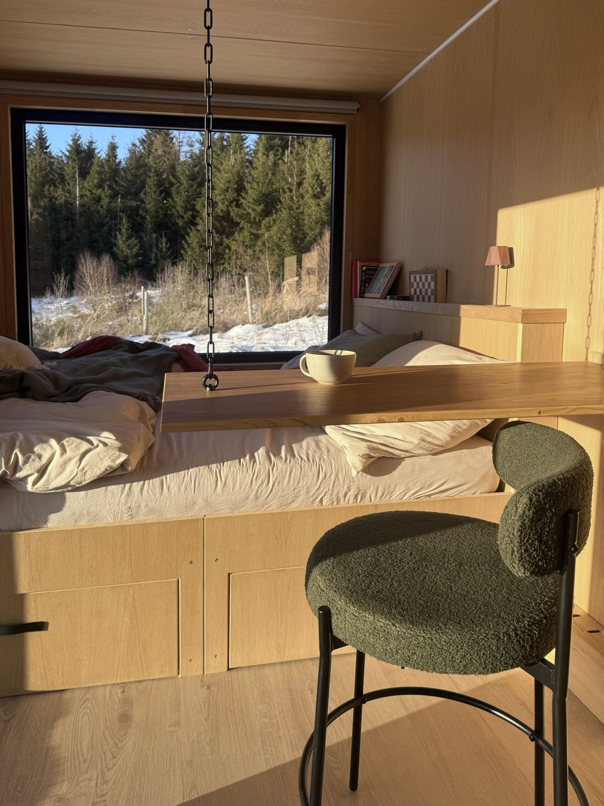 Tiny house je ukrytý v lese, daleko od civilizace, obklopený jen přírodou a tichem. Najdete tu klid a soukromí, které dnes není samozřejmostí. Ráno se probudíte s výhledem do lesa, večer můžete sedět venku a sledovat západ slunce – a kolem nebude nic než příroda.